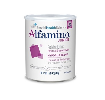 Alfamino™ contains free amino acids, which are the building blocks of protein. This helps minimize the chance of an allergic reaction. Alfamino™ formula is manufactured under Nestlé’s high quality standards. Alfamino™ formula has a unique fat blend containing medium chain triglycerides (MCT) to help children with fat malabsorption. Alfamino™ formula is nutritionally complete and provides essential nutrients your little one needs to grow. Alfamino™ formula is easy to digest and is lactose-free and gluten-free.